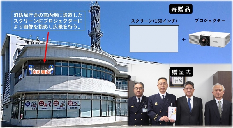 下関市防災協会は昭和30年7月に設立され、令和2年度に65周年を迎えました。 設立65周年記念事業として、令和3年2月22日に下関市へプロジェクターを活用したデジタルサイネージ一式を寄贈し、消防局庁舎に設置されました。火災予防や消防に関するPR映像が投影され、広く市民への広報活動に活用されることとなります。 今後も安全で安心なまちづくりを目指し、各種事業を進めてまいりますので、会員事業所の皆様方のご支援ご協力をお願いいたします。